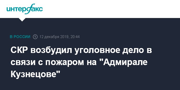 Москва. 12 декабря. INTERFAX.RU - Причины пожара на крейсере "Адмирал Кузнецов" в Мурманске будут расследоваться по статье УК РФ о нарушении правил безопасности при ведении строительных работ, сообщили в пресс-службе Следственного комитета РФ (СКР).