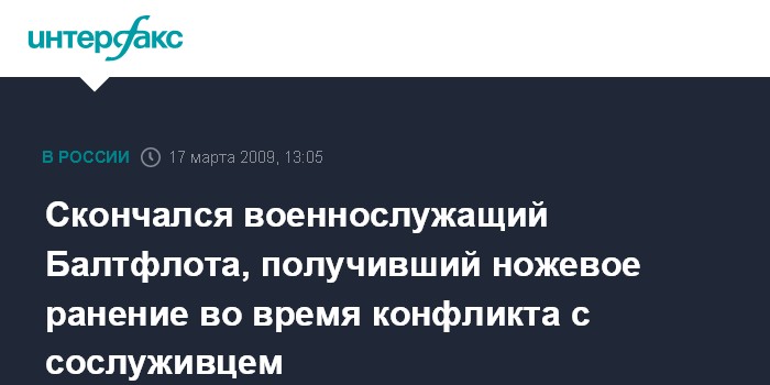 Москва. 17 марта. INTERFAX.RU - Военнослужащий Балтийского флота, получивший ножевое ранение во время конфликта с сослуживцем, скончался в больнице, сообщили "Интерфаксу" во вторник в штабе БФ. "Военнослужащий по контракту ефрейтор Петр Сырчиков, получивший ножевое ранение во время конфликта с сослуживцем 3 марта, скончался в областной больнице Калининграда. Все это время он находился в реанимационном отделении в бессознательном состоянии", - сообщил офицер штаба.
