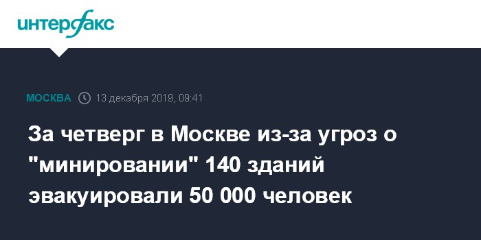 Москва. 13 декабря. INTERFAX.RU - В минувший четверг из-за угроз о "минировании" в Москве проверили 140 объектов, где в общей сложности прошла эвакуация 50 000 человек, сообщил "Интерфаксу" информированный источник.