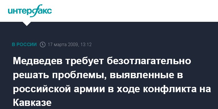 Москва. 17 марта. INTERFAX.RU - Конфликт вокруг Южной Осетии выявил ряд недостатков в российских вооруженных силах, которые требуют немедленного реагирования, заявил президент РФ Дмитрий Медведев. "Этот конфликт является поводом для внимания и для определенных выводов", - сказал президент во вторник на расширенном заседании коллегии Минобороны. Он подчеркнул, что российские "миротворцы показали себя лучшим образом, здесь никаких сомнений быть не может". "Но конфликт обнажил наши недостатки", - добавил Медведев.
