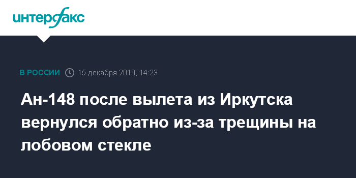 Москва. 15 декабря. INTERFAX.RU - Самолет Ан-148, следовавший в воскресенье из Иркутска в Красноярск, вернулся после взлета в аэропорт из-за трещины на лобовом стекле, сообщил "Интерфаксу" информированный источник.