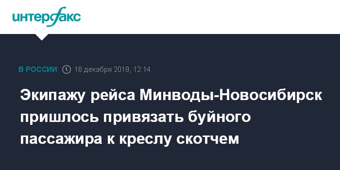 Москва. 16 декабря. INTERFAX.RU - Экипажу самолета, прилетевшего в Новосибирск из Минеральных вод, пришлось "зафиксировать в кресле" неадекватного пассажира и затем сдать его полиции, сообщили в пресс-службе МВД. Мужчину примотали к креслу скотчем, уточнили в пресс-службе управления на транспорте МВД по Сибирскому федеральному округу.