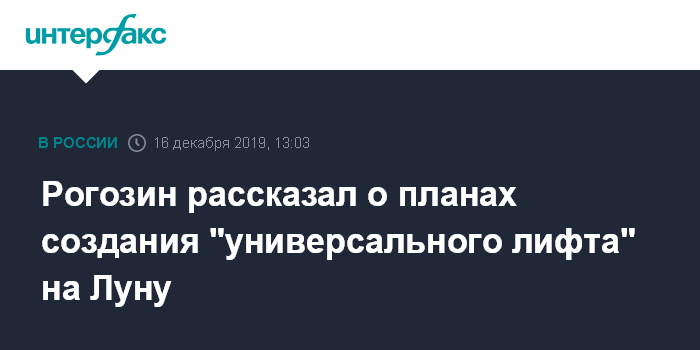 Москва. 16 декабря. INTERFAX.RU - "Роскосмос" планирует частично окупить затраты на Лунную программу за счет доставки на поверхность спутника Земли коммерческих грузов, создав так называемый универсальный лифт, сообщил журналистам глава госкорпорации Дмитрий Рогозин.