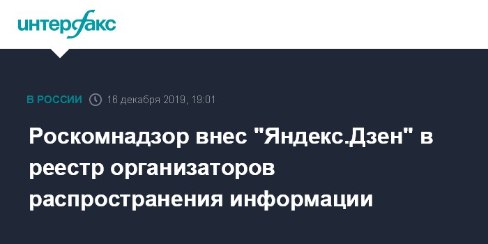 Роскомнадзор внес "Яндекс.Дзен" в реестр организаторов распространения информации