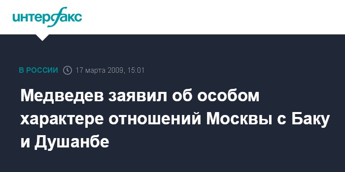 Москва. 17 марта. INTERFAX.RU - Президент Дмитрий Медведев заявил о важности для России отношений с Азербайджаном и Таджикистаном в ходе встречи с новоназначенными российскими послами в этих странах.