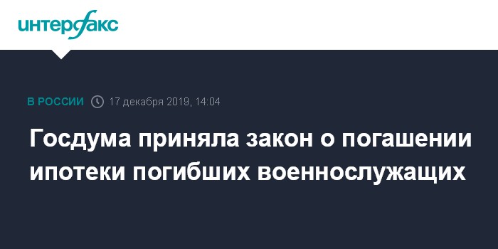 Москва. 17 декабря. INTERFAX.RU - Госдума на заседании во вторник приняла в третьем, окончательном, чтении закон, предусматривающий досрочное погашение ипотеки в связи с гибелью или смертью военнослужащего.