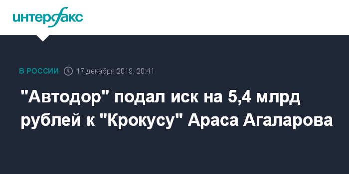 Москва. 17 декабря. INTERFAX.RU - Арбитражный суд Москвы зарегистрировал иск госкомпании "Автодор" на 5,4 млрд рублей к АО "Крокус Интернэшнл" бизнесмена Араса Агаларова, которое участвовало в строительстве Центральной кольцевой автодороги (ЦКАД) в Подмосковье.