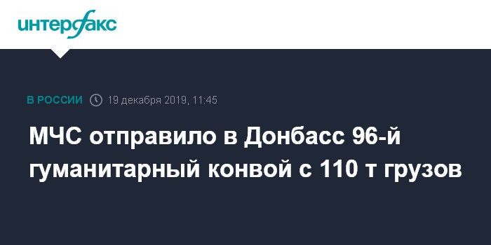 Москва. 19 декабря. INTERFAX.RU - МЧС России сообщило, что направил в Донецк и Луганск 96-ю с 2014 года колонну грузовиков с гуманитарной помощью. В Донбасс отправлено более 110 тонн грузов, в том числе лекарства и новогодние подарки.