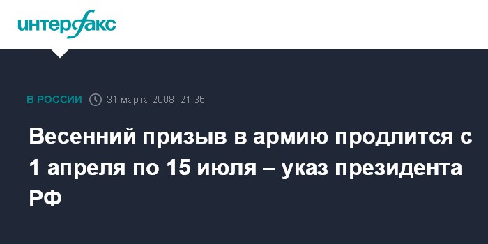 Москва. 31 марта. ИНТЕРФАКС - Президент России Владимир Путин подписал указ о призыве в апреле - июле нынешнего года граждан РФ на военную службу и об увольнении с военной службы граждан, проходящих военную службу по призыву, сообщила пресс-служба Кремля.