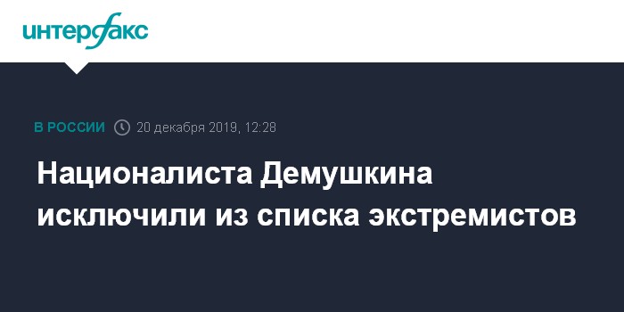 Москва. 20 декабря. INTERFAX.RU - Росфинмониторинг исключил националиста Дмитрий Демушкина из перечня организаций и физических лиц, в отношении которых имеются сведения об их причастности к экстремистской деятельности или терроризму, сообщается на сайте ведомства.