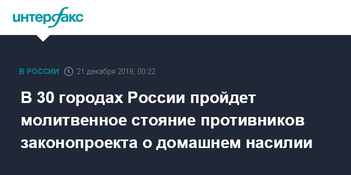 Москва. 21 декабря. INTERFAX.RU - Акции людей, не согласных с положениями законопроекта о семейно-бытовом насилии, состоятся в субботу в 30 городах России, сообщили журналистам организаторы.