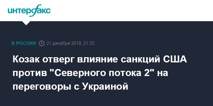 "Вчерашний диалог подтверждает, что нам особо посредники, которые часто уводят в сторону (не нужны - ИФ). Вчера одновременно, было похоже, что - я не следил за временем - синхронно мы подписывали протокол об урегулировании отношений между нами, а там появились санкции (США в отношении участников строительства газопроводов "Северный поток 2" и "Турецкий поток", которые призваны снизить транзит российского газа через Украину - ИФ). Сложилось глубокое у меня убеждение, что это не оказало влияния никакого ни на украинскую, ни на европейскую, ни на нас", - сказал Козак в субботу в эфире программы "Вести" в субботу с Сергеем Брилевым" на телеканале "Россия 1" (ВГТРК).