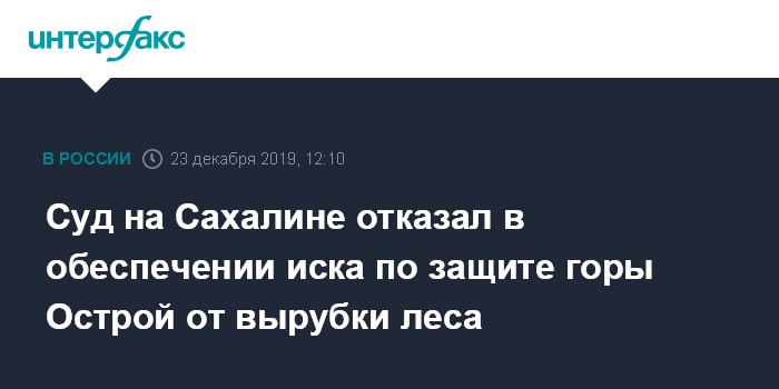 "Судья Южно-Сахалинского городского суда отказала нам в обеспечении иска по защите от вырубки леса на горе Острой, которая ведется в рамках территории опережающего развития ТОР "Горный воздух". Будем обжаловать это решение в областном суде", - сообщил агентству "Интерфакс" руководитель региональной общественной организации (РОО) "Экологическая вахта Сахалина" Дмитрий Лисицын.