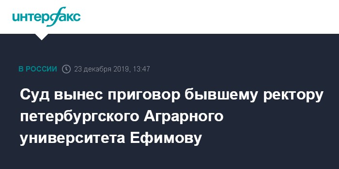 Москва. 23 декабря. INTERFAX.RU - Пушкинский районный суд Петербурга огласил приговор в отношении бывшего ректора Санкт-Петербургского государственного аграрного университета (СПбГАУ) Виктора Ефимова, признанного виновным в присвоении 36 млн рублей вуза.