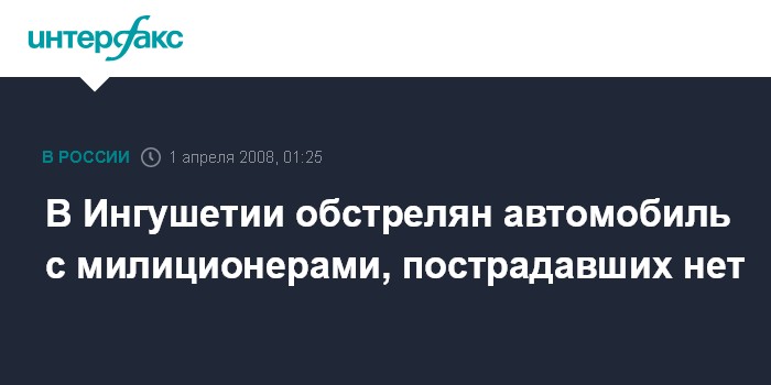 Назрань. 1 апреля. ИНТЕРФАКС-ЮГ - В Ингушетии неизвестные лица совершили обстрел автомобиля, в котором находились сотрудники ОВД Назрани, жертв и пострадавших нет.