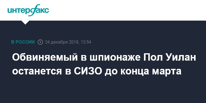 Москва. 24 декабря. INTERFAX.RU - Московский городской суд оставил под стражей до 29 марта гражданина США, Ирландии и Канады, а также поданного Великобритании Пола Уилана, обвиняемого в России в шпионаже, передал корреспондент "Интерфакса".
