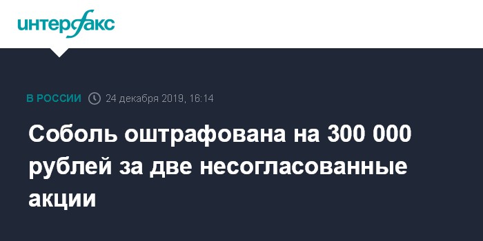 Соболь оштрафована на 300 000 рублей за две несогласованные акции