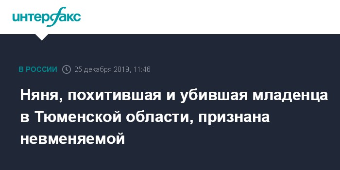 Москва. 25 декабря. INTERFAX.RU - Экспертиза психологического состояния жительницы Тюменской области, которая в сентябре этого года убила младенца, показала, что она страдает психическим расстройством.