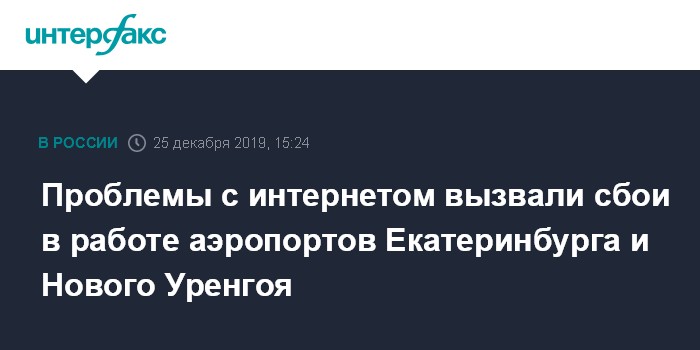Москва. 25 декабря. INTERFAX.RU - В среду утром из-за перебоев с интернетом нарушалась работа аэропорта "Кольцово" в Екатеринбурге и аэропорта Нового Уренгоя, сообщили представители обоих предприятий.