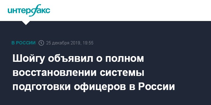 Москва. 25 декабря. INTERFAX.RU - Система подготовки офицерского состава в России - как выпускников военных училищ, так и военных академий - в настоящее время полностью восстановлена, заявил в среду на заседании общественного совета при Минобороны глава ведомства Сергей Шойгу.