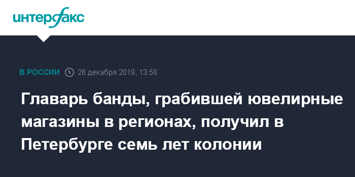 Москва. 26 декабря. INTERFAX.RU - Петербургский городской суд огласил приговор главе преступной группы, участники которой ограбили ювелирные салоны в ряде регионов РФ на 120 млн рублей.