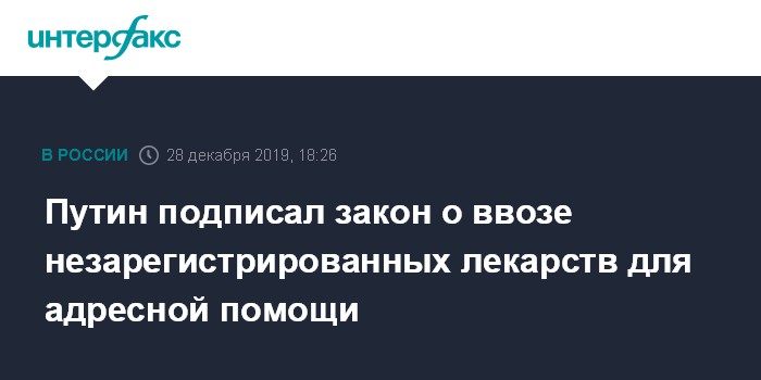 Москва. 28 декабря. INTERFAX.RU - Президент России Владимир Путин подписал закон, допускающий ввоз в РФ конкретных партий незарегистрированных лекарств, содержащих наркотические и психотропные вещества, для помощи пациентам по решению врачебной комиссии.