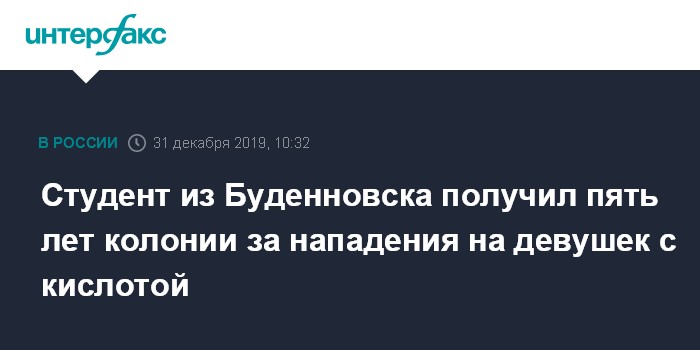 Москва. 31 декабря. INTERFAX.RU - Буденновский городской суд Ставропольского края приговорил к пяти годам колонии общего режима студента медицинского колледжа, облившего кислотой трех девушек в июне 2017 года, сообщает пресс-служба суда.