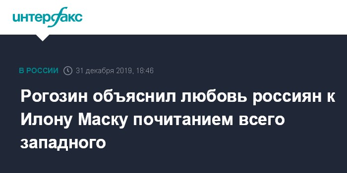 Москва. 31 декабря. INTERFAX.RU - Глава "Роскосмоса" Дмитрий Рогозин заявил, что скептически относится к восторгам некоторых россиян по поводу деятельности гендиректора SpaceX Илона Маска и владельца компании Blue Origin Джеффа Безоса.