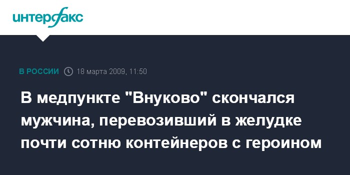 Москва. 18 марта. INTERFAX.RU - В аэропорту "Внуково" скончался наркокурьер, перевозивший в собственном желудке 1,5 кг героина, сообщили в Федеральной таможенной службе (ФТС) в среду.