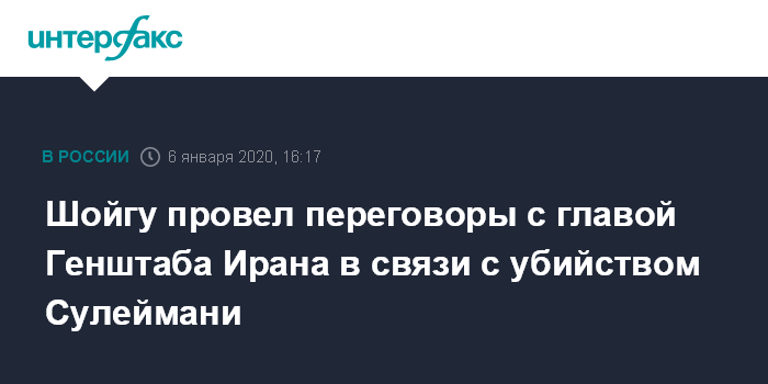 Москва. 6 января. INTERFAX.RU - Меры по недопущению эскалации обстановки на Ближнем Востоке после убийства военными США иранского генерала Касема Сулеймани обсудили в понедельник в ходе телефонного разговора министр обороны России Сергей Шойгу и глава Генштаба Ирана Мохаммад Багери, сообщили в Минобороны РФ.