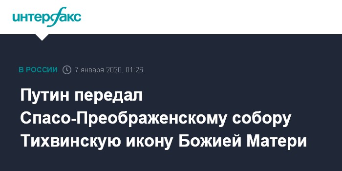 Москва. 7 января. INTERFAX.RU - Президент России Владимир Путин передал Спасо-Преображенскому собору Санкт-Петербурга икону Божией Матери "Тихвинская" с предстоящими святыми.