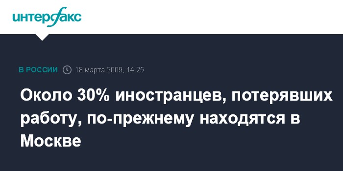 Москва. 18 марта. INTERFAX.RU - Около 30% иностранных граждан, потерявших работу, не уехали из Москвы, сообщил начальник Управления Федеральной миграционной службы России по Москве Федор Карповец.