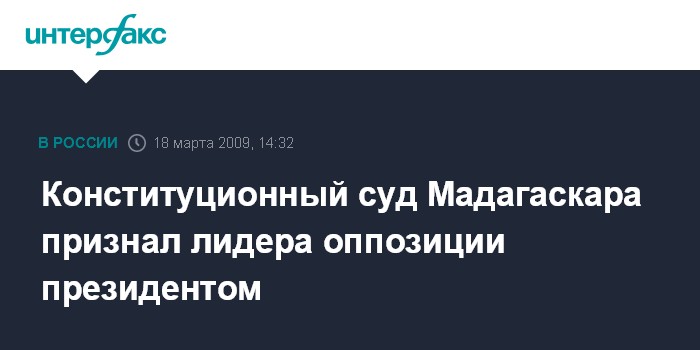 Москва. 18 марта. INTERFAX.RU - Конституционный суд Мадагаскара в среду признал лидера оппозиции Андри Радзоэлину новым президентом страны, сообщила британская телерадиокорпорация BBC. Это решение принято на следующий день после того, как бывший президент страны Марк Раваломанана передал власть в руки военных, которые в свою очередь передали ее Радзоэлине.