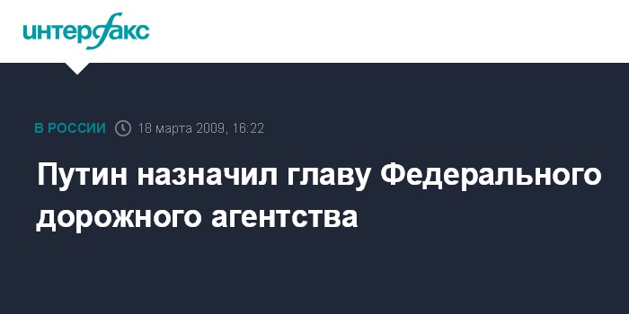 Москва. 18 марта. INTERFAX.RU - Премьер-министр РФ Владимир Путин своим распоряжением назначил Анатолия Чабунина руководителем Федерального дорожного агентства, сообщает в среду пресс-служба правительства РФ.