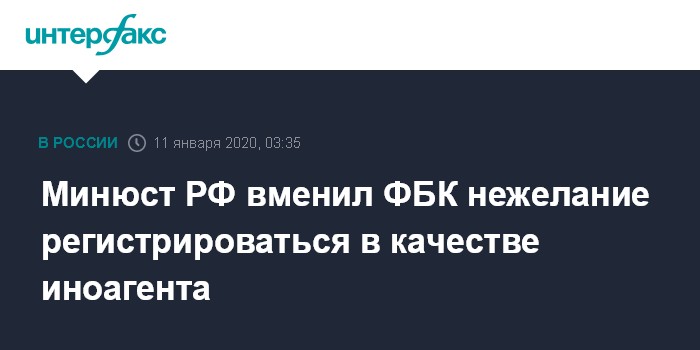 Москва. 11 января. INTERFAX.RU - Минюст РФ вменяет основанному оппозиционером Алексеем Навальным Фонду борьбы с коррупцией (ФБК), включенному в реестр иностранных агентов, нежелание зарегистрироваться в этом статусе, сообщили в пресс-службе министерства.