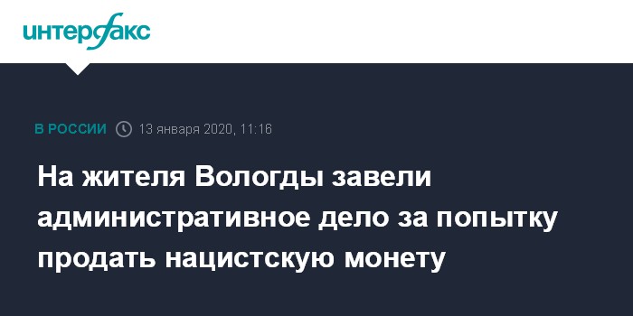 Москва. 13 января. INTERFAX.RU - Безработному жителю Вологды грозит штраф или арест за попытку продать в интернете монету времен нацистской Германии, сообщила пресс-служба управления на транспорте МВД России по СЗФО.