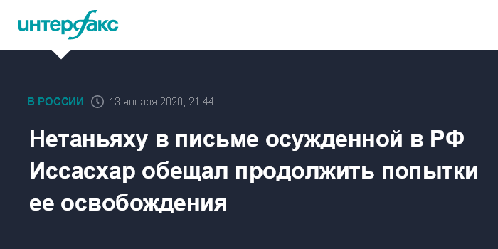 Москва. 13 января. INTERFAX.RU - Премьер-министр Израиля Биньямин Нетаньяху направил письмо осужденной в России и отбывающей срок в тюрьме израильтянке Нааме Иссасхар, сообщает в понедельник The Jerusalem Post.