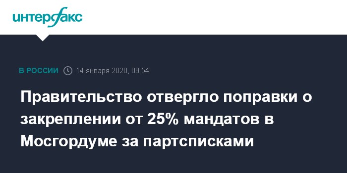 Москва. 14 января. INTERFAX.RU - Правительство даст отрицательный отзыв на законопроект сенатора Владимира Лукина, который предлагал ввести правило о том, что не менее 25% мандатов в заксобраниях Москвы и Петербурга должны распределяться по партийным спискам.