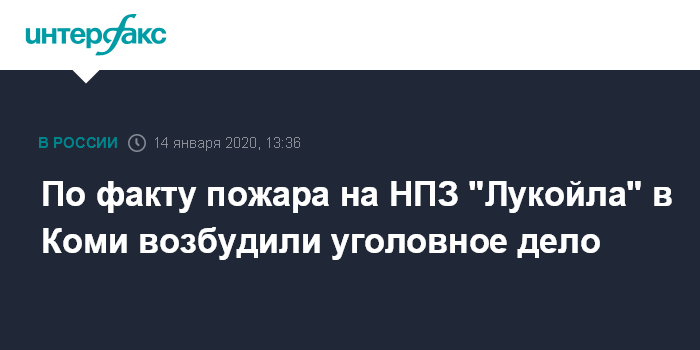 Москва. 14 января. INTERFAX.RU - В Коми по факту пожара на нефтеперерабатывающем заводе (НПЗ) ООО "ЛУКОЙЛ-Ухтанефтепереработка" возбуждено уголовное дело, сообщает пресс-служба республиканского управления Следственного комитета РФ (СКР) во вторник.
