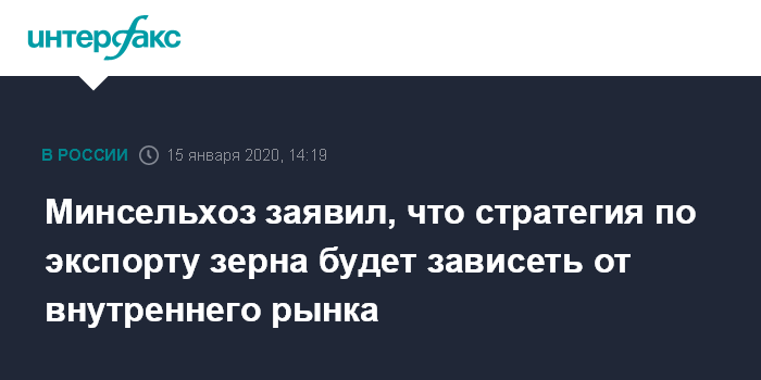 Москва. 15 января. INTERFAX.RU - Минсельхоз РФ будет выстраивать стратегию по экспорту зерна, исходя из ситуации на внутреннем рынке.