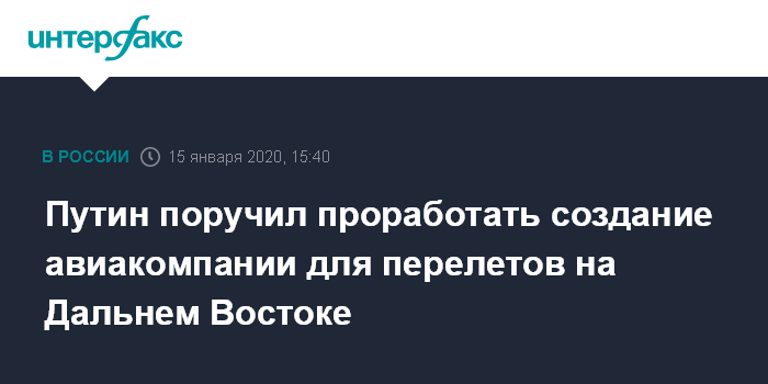 Москва. 15 января. INTERFAX.RU - Президент Владимир Путин поручил правительству проработать создание авиакомпании с парком из российских самолетов для перевозок пассажиров и грузов в Дальневосточном федеральном округе.
