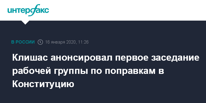 Москва. 16 января. INTERFAX.RU - Первое заседание рабочей группы по обсуждению предложенных президентом поправок в Конституцию пройдет у Владимира Путина уже 16 января, объявил сопредседатель группы сенатор Андрей Клишас. Ранее он говорил, что первое рабочее заседание состоится в пятницу.
