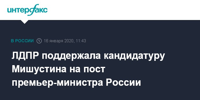 Москва. 16 января. INTERFAX.RU - Фракция ЛДПР поддержала назначение Михаила Мишустина премьер-министром РФ.