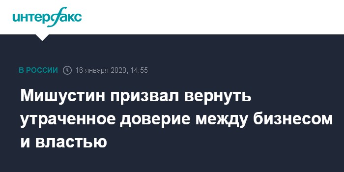 Москва. 16 января. INTERFAX.RU - Кандидат на пост премьер-министра РФ Михаил Мишустин высказался за укрепление доверия между властью и бизнесом, считает необходимым проанализировать причины, мешающие развитию предпринимательства.