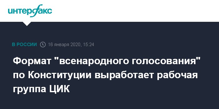 Москва. 16 января. INTERFAX.RU - При Центризбиркоме создана рабочая группа, которая разработает и представит на согласование президенту формат "всенародного голосования" по поправкам в Конституцию. Об этом через пресс-службу сообщила председатель ЦИК Элла Памфилова.