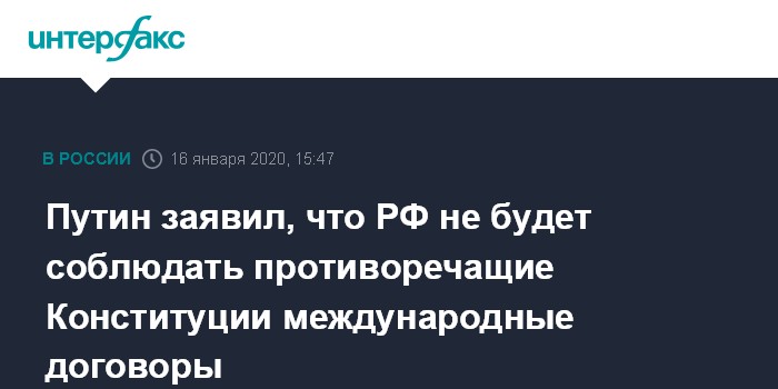 "Если договор, какой бы то ни было, противоречит Конституции, он и заключаться не должен. А если был заключен, и мы обнаружили, что там есть нарушение Конституции, он не будет действовать на территории РФ", - заявил глава государства.