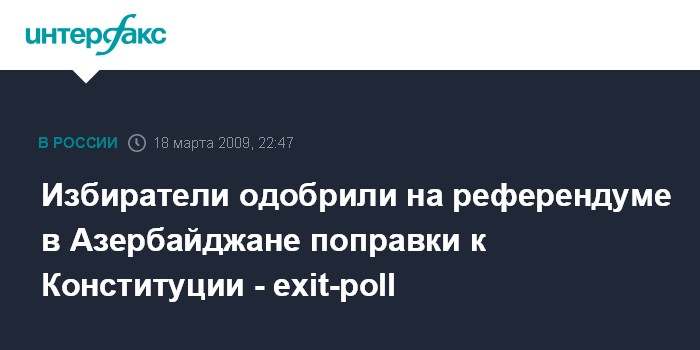 Баку. 18 марта. ИНТЕРФАКС-АЗЕРБАЙДЖАН - Предварительные данные "exit-poll" показывают, что принимавшие участие в референдуме в среду в Азербайджане избиратели одобрили все поправки к Конституции, сообщила агентству "Интерфакс-Азербайджан" директор независимого центра исследований "ELS" Ирада Ягубова.