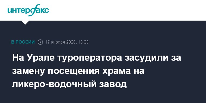 Москва. 17 января. INTERFAX.RU - Жительница Красноуфимска (Свердловская область) отсудила моральную компенсацию у туроператора за изменение программы автобусного тура, вместо визита в храм ей предложили посетить магазин при ликеро-водочном заводе, сообщает пресс-служба облсуда.