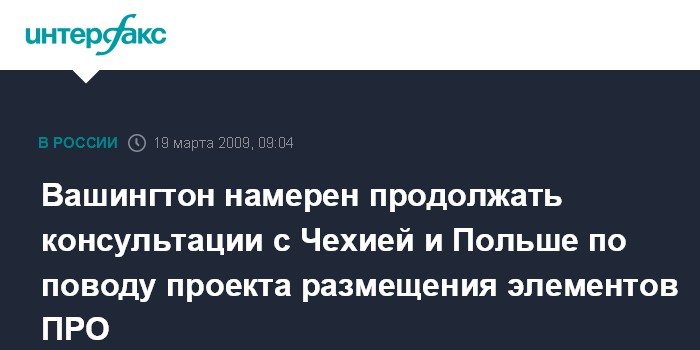 Москва. 19 марта. INTERFAX.RU - США будут продолжать консультации с правительствами Чехии и Польши в отношении размещения элементов ПРО в этих странах, заявил в среду на брифинге в госдепартаменте США и.о. пресс-секретаря госдепартамента Роберт Вуд.