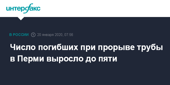 Москва. 20 января. INTERFAX.RU -- Количество жертв прорыва трубы в отеле в Перми увеличилось до пяти человек, сообщили агентству "Интерфакс-Поволжье" в пресс-службе администрации губернатора и главы региона в понедельник.